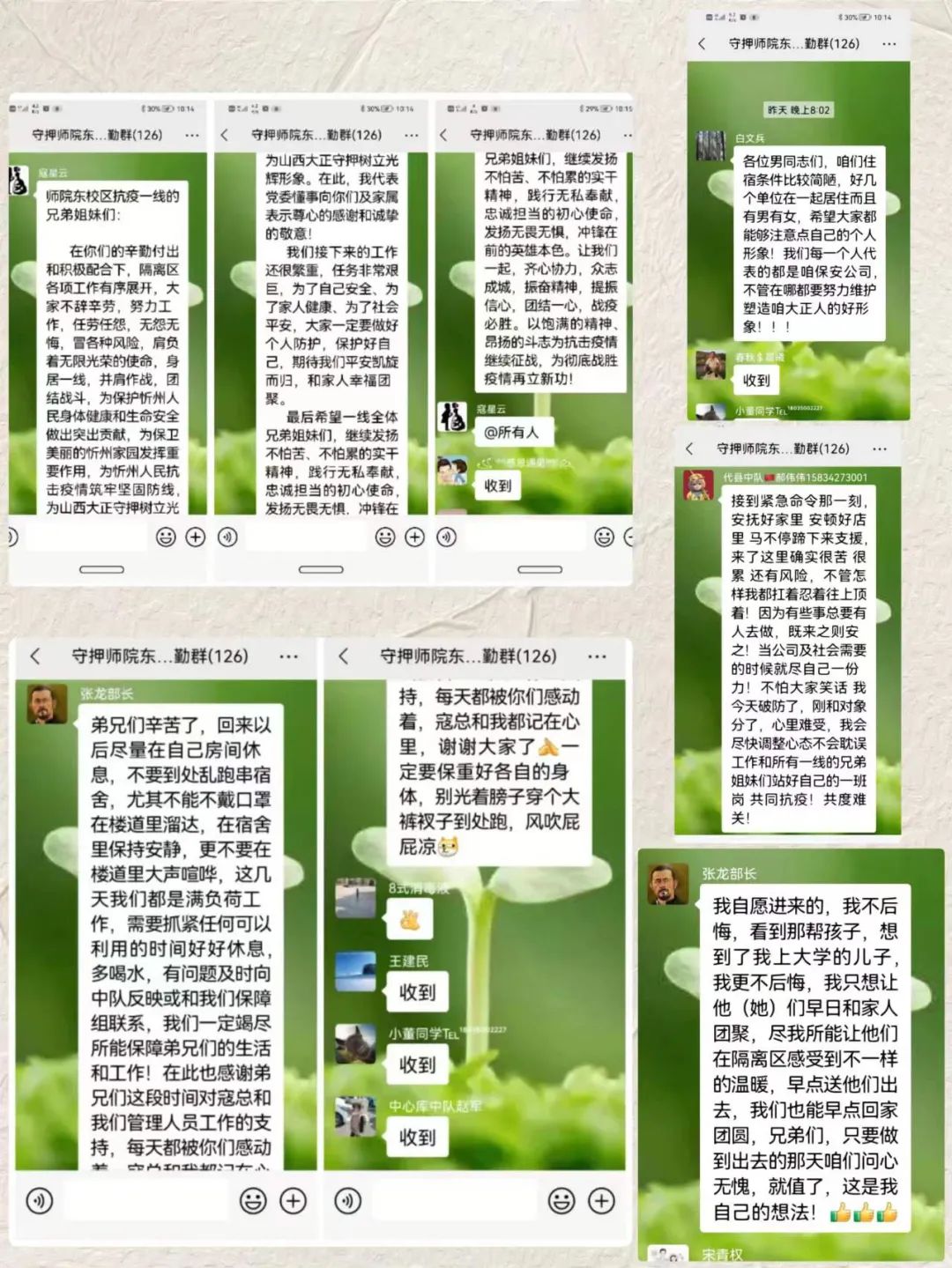 此外,頓村棚戶區(qū)、師院主校區(qū)、民兵應(yīng)急、醫(yī)療機(jī)構(gòu)、交通樞紐等其它五支突擊分隊(duì)全體參戰(zhàn)隊(duì)員在做好自身防護(hù)的前提下,積極配合相關(guān)單位履職盡責(zé)。在第二方艙醫(yī)院和龍崗二區(qū)、頓村棚戶區(qū)隔離點(diǎn)執(zhí)行外圍警戒的直屬公司和機(jī)關(guān)部門人員,不懼危險(xiǎn)、堅(jiān)守崗位,時(shí)刻保持高度警惕,輪班值守重要通道,嚴(yán)禁無關(guān)人員進(jìn)入隔離地帶、破壞隔離設(shè)施,確保隔離點(diǎn)和方艙周邊安全有序;在師院主校區(qū)、頓村棚戶區(qū)隔離點(diǎn)執(zhí)行餐食物資配送的機(jī)關(guān)部門和物業(yè)公司人員,不辭辛勞、上下奔波,及時(shí)把美味、可口、溫?zé)岬娘埐怂偷礁綦x人員手中,像一抹抹溫暖的陽光,用溫情守護(hù)讓隔離人員安心、舒心;在市醫(yī)院、中醫(yī)院、忻州西站等處在執(zhí)行秩序維護(hù)的保安直屬公司人員,認(rèn)真把關(guān)、仔細(xì)查驗(yàn)進(jìn)出人員的“三碼一溫”,有力地保障了重點(diǎn)部位疫情防控期間的安全穩(wěn)定運(yùn)行。