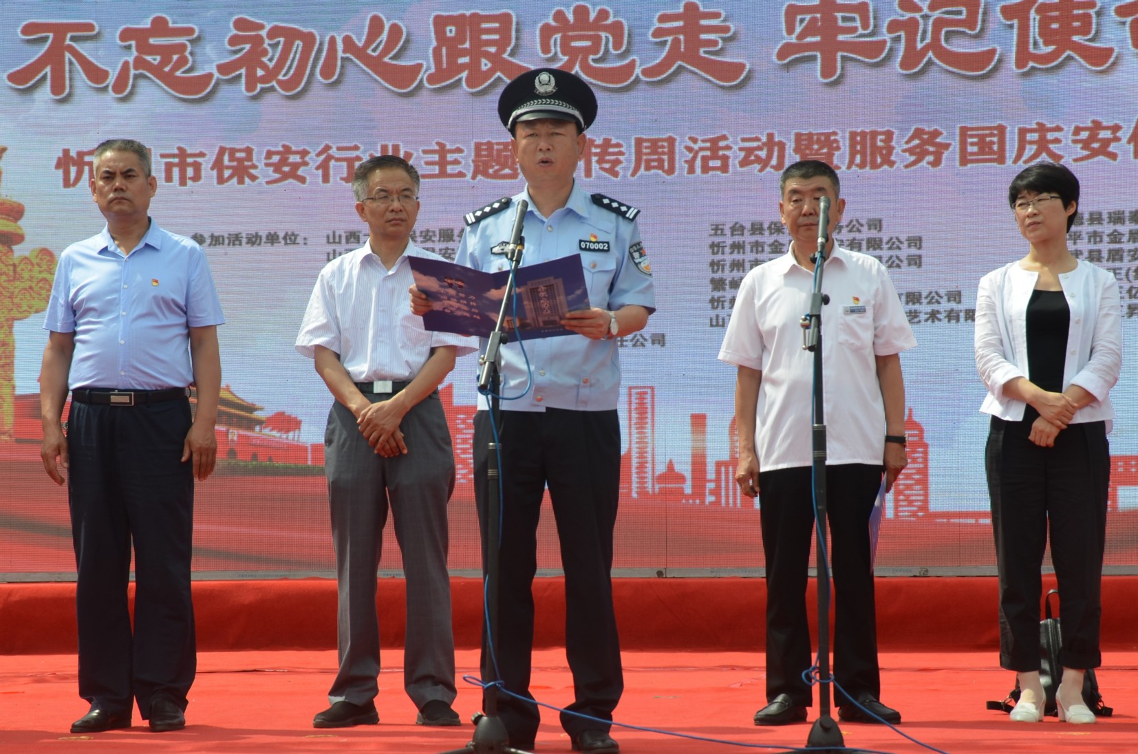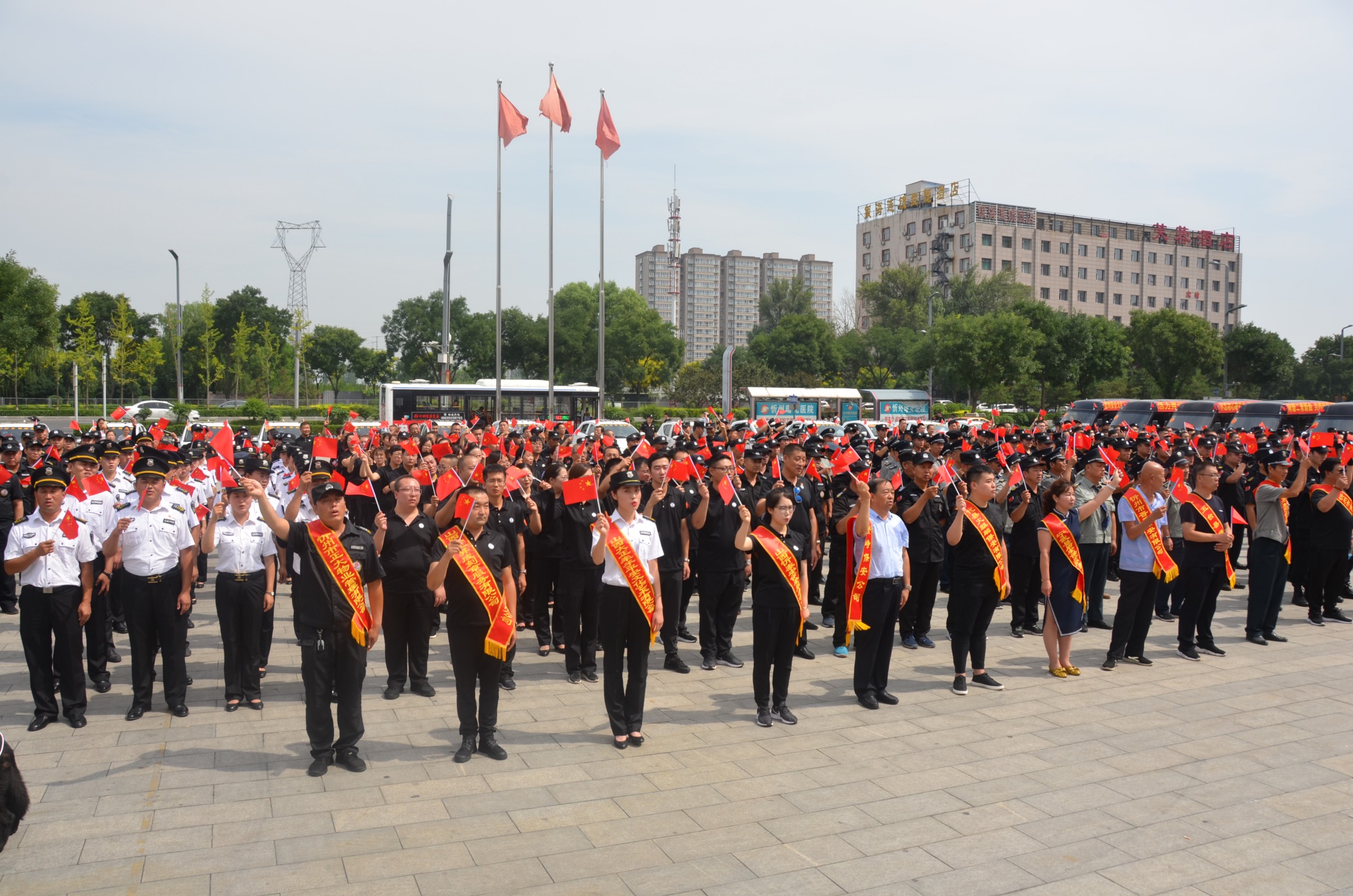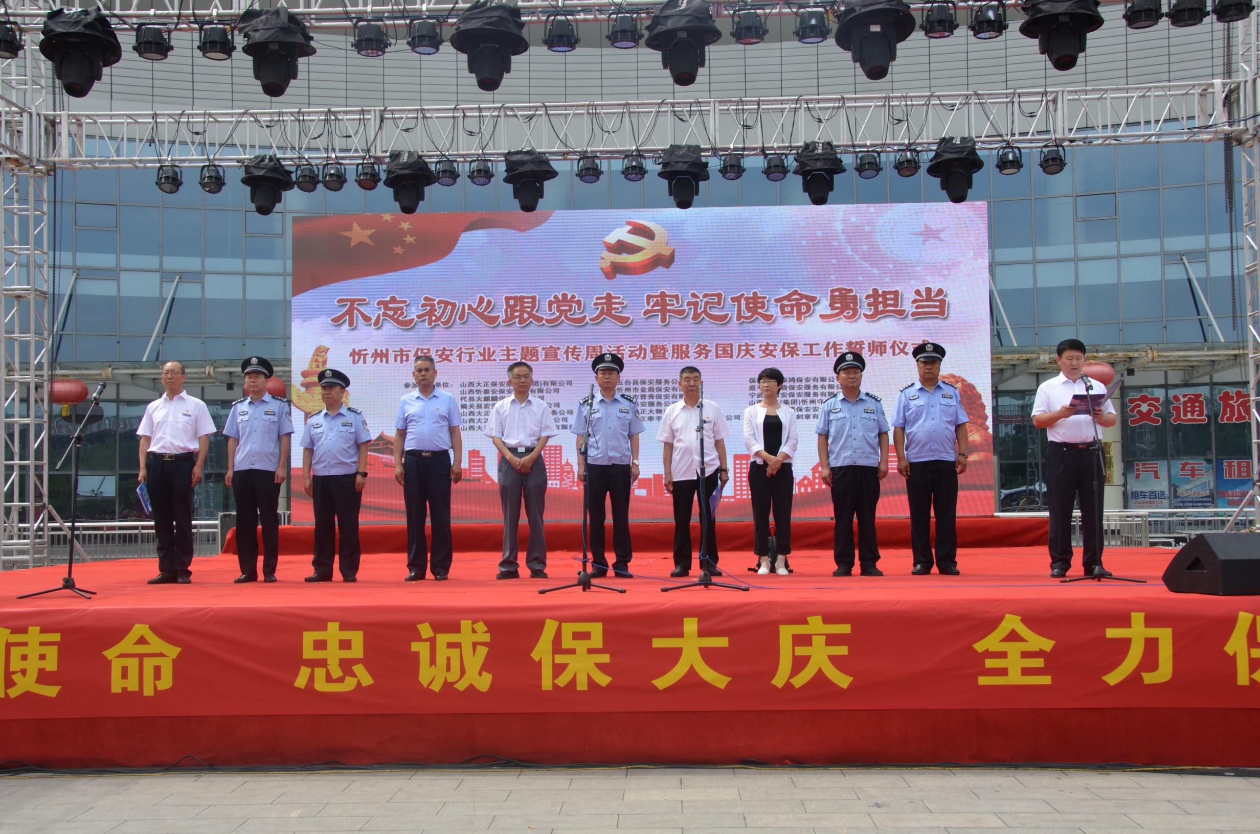 7月24日,忻州市公安局、忻州市保安協(xié)會(huì)會(huì)同山西大正保安服務(wù)有限公司、忻州市公安局直屬分局、忻州市公安局忻府分局及全市18家保安企業(yè)在忻州市客運(yùn)中心與全國(guó)各地同步舉行保安行業(yè)“不忘初心跟黨走、牢記使命勇?lián)?dāng)”主題宣傳周活動(dòng)暨服務(wù)國(guó)慶安保工作誓師儀式。