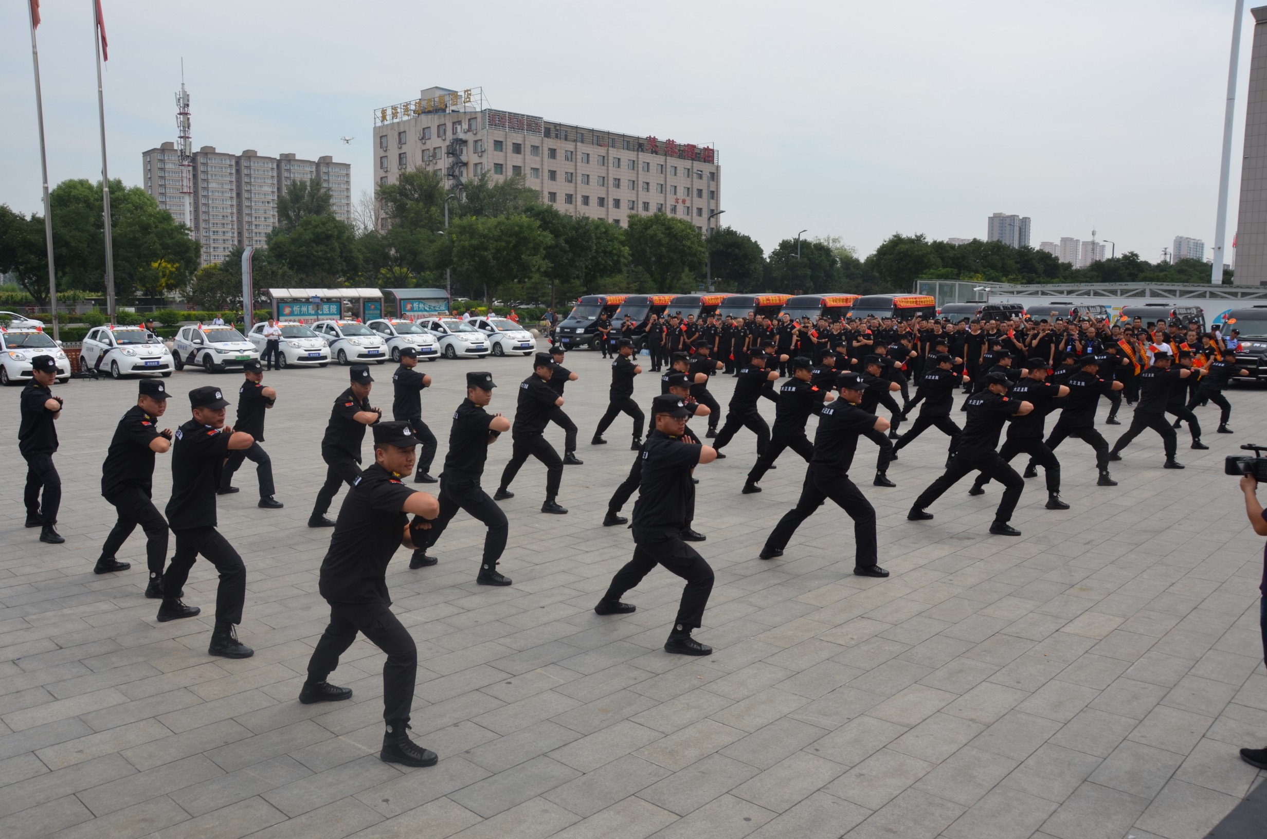 儀式在現(xiàn)場(chǎng)全體人員齊聲高唱的《歌唱祖國(guó)》歌聲中達(dá)到高潮,大家揮舞著手中的國(guó)旗,表達(dá)了對(duì)祖國(guó)的良好祝愿。山西大正保安服務(wù)有限公司保安隊(duì)員進(jìn)行了擒敵拳操展示,剛勁有力、整齊劃一的動(dòng)作,體現(xiàn)出大正保安隊(duì)員苦練基本功的豐碩成果,展現(xiàn)了大正保安隊(duì)員良好的精神風(fēng)貌和戰(zhàn)無(wú)不勝、攻無(wú)不克的專業(yè)素養(yǎng)。儀式結(jié)束后,由各保安企業(yè)組織的30余輛保安業(yè)務(wù)車在忻州城區(qū)進(jìn)行巡回宣傳。
