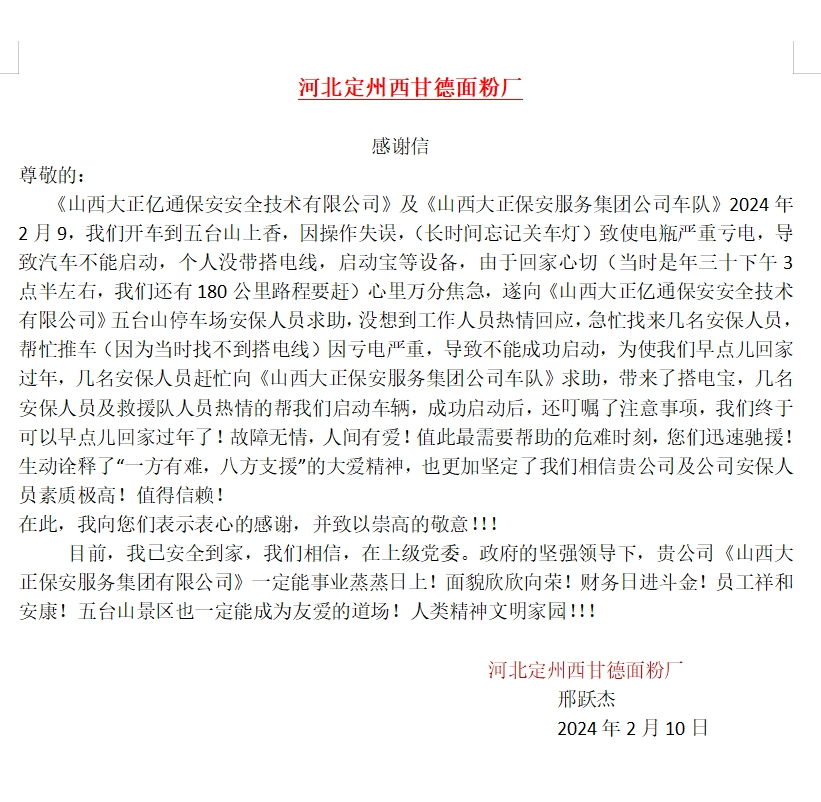 這些看似微不足道的小事,卻讓游客感受到了五臺山不僅有著豐富的文化底蘊和美麗的自然風(fēng)光,更有著溫暖人心的服務(wù)。為了表達對執(zhí)勤隊員無私幫助的感激之情,一位游客特意寫了一封感謝信,贊揚他們的專業(yè)和熱心,感謝他們?yōu)橛慰蛶淼谋憷桶残摹?/p>