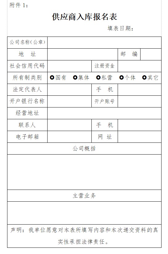 為滿足采購工作需求,現(xiàn)公開征集符合本公司采購條件的供應(yīng)商加入公司“供應(yīng)商數(shù)據(jù)庫”,歡迎符合資質(zhì)的供應(yīng)商參加報名。