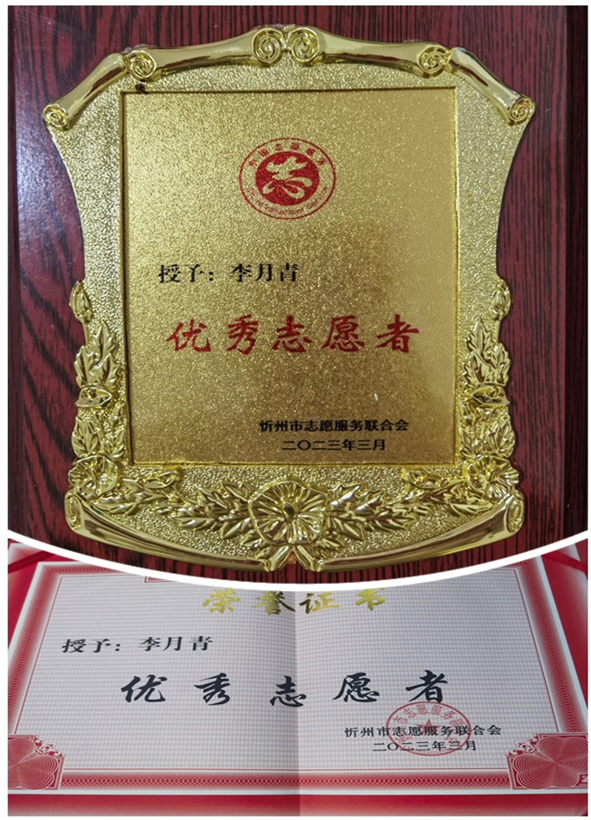 山西大正集團公司李月青榮獲忻州市志愿服務(wù)聯(lián)合會2022年度“優(yōu)秀志愿者”榮譽稱號,并作為志愿者團隊代表發(fā)言。