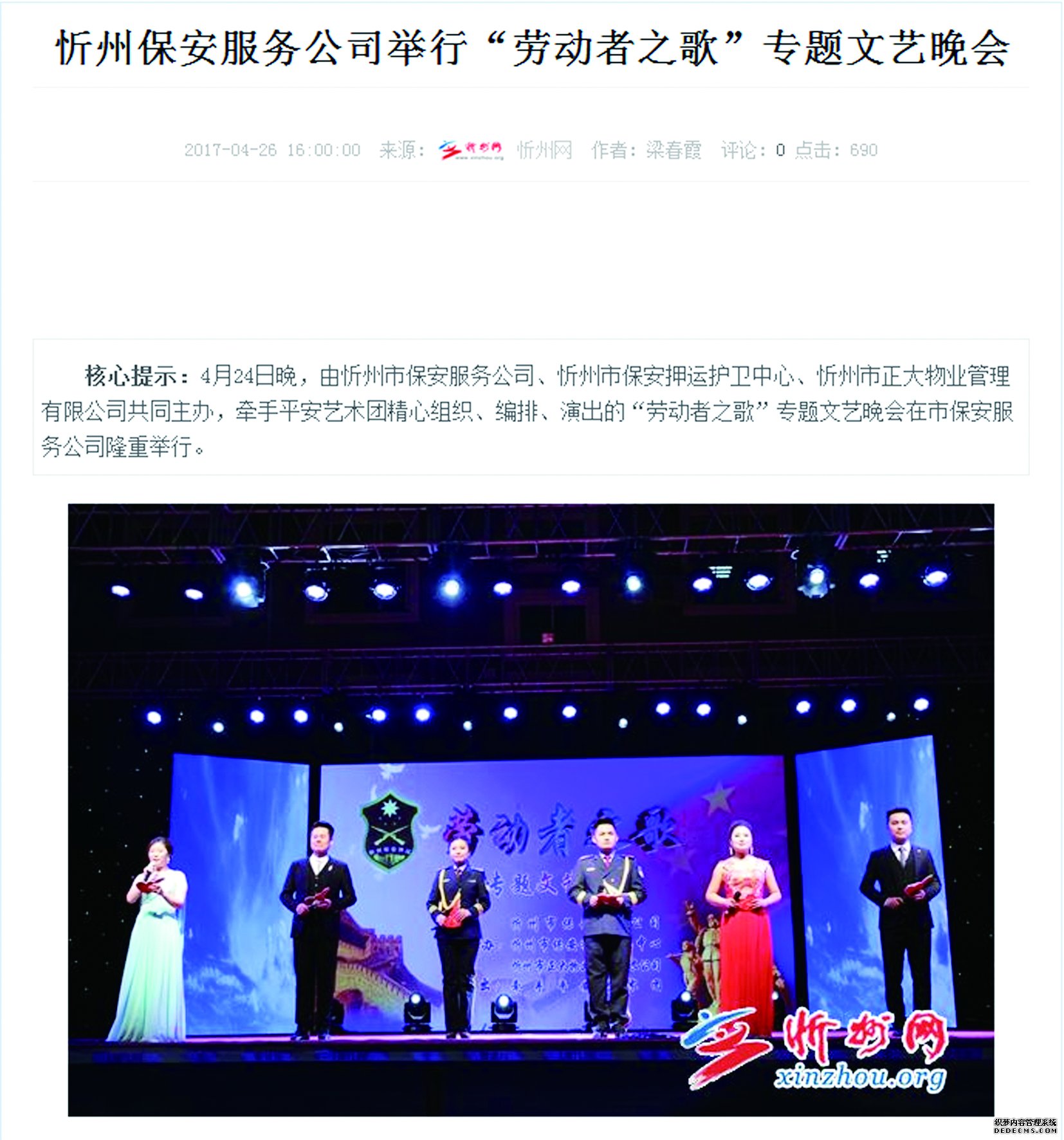 值“五一”國際勞動(dòng)節(jié)、“五四”青年節(jié)來臨之際,我公司成功舉辦“慶五一·迎五四”系列文體活動(dòng)。在公司西區(qū)大院舉行“勞動(dòng)者之歌”專題文藝晚會(huì)。舉辦這次活動(dòng)為進(jìn)一步豐富員工文化生活、促進(jìn)溝通交流、增強(qiáng)團(tuán)隊(duì)凝聚力,提高廣大員工的歸屬感和主人翁意識(shí),打造和諧共贏的企業(yè)文化,樹立企業(yè)良好的社會(huì)形象。向長期以來關(guān)心、支持公司事業(yè)發(fā)展的社會(huì)各界人士表示衷心的感謝。節(jié)目內(nèi)容包括舞蹈、配樂詩朗誦、制式服裝秀、歌曲、小品、曲藝、戲曲等。異彩紛呈的節(jié)目博得觀眾陣陣掌聲,吸引了眾多市民駐足欣賞。