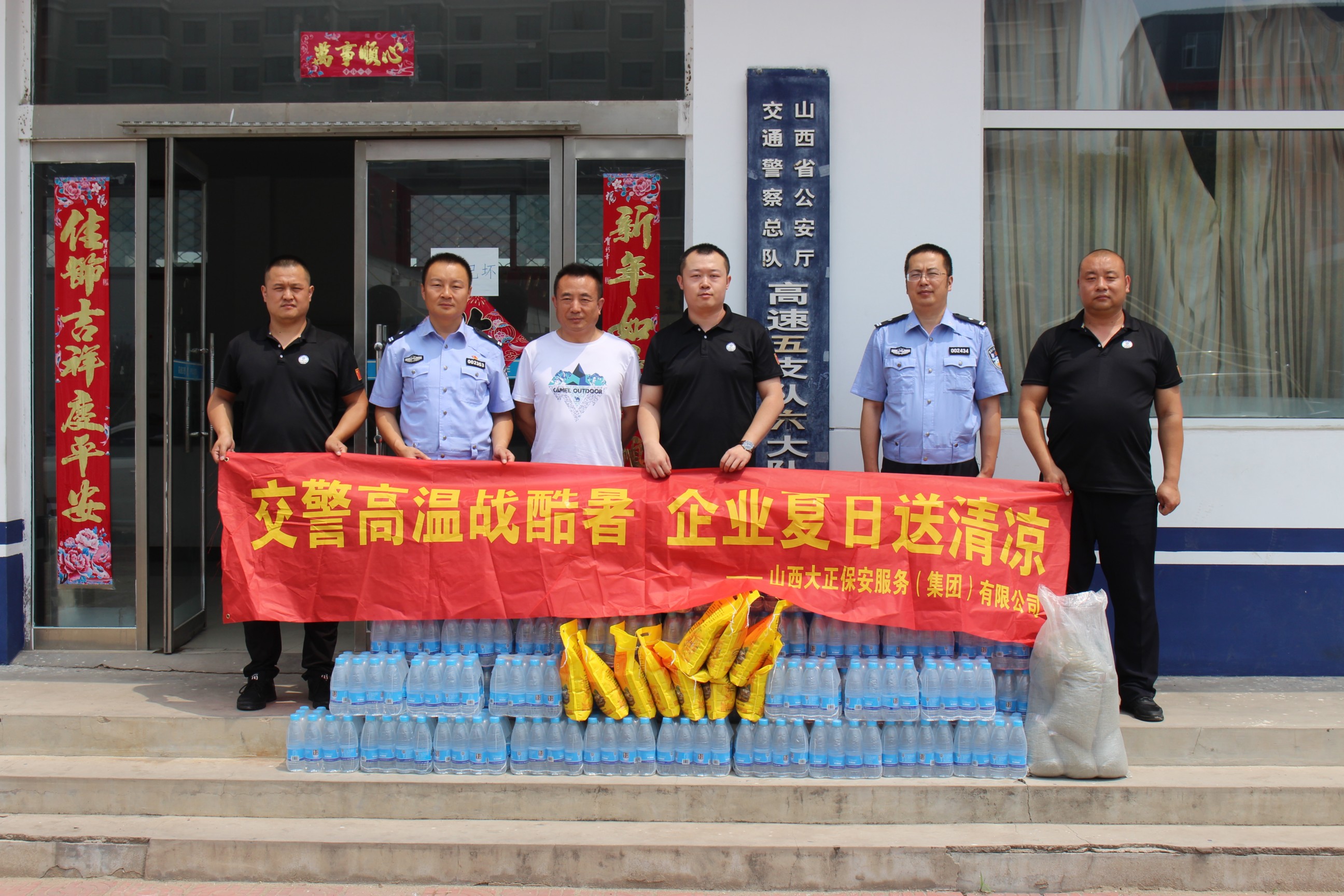 公司慰問人員對一線執(zhí)勤民警在高溫酷暑中堅守崗位,無私奉獻,全力保障市區(qū)道路安全暢通的工作精神表示由衷欽佩,各交警部門負責人對山西大正保安服務(集團)有限公司對交警部門工作的支持與配合表示感謝,表示將會立足本職,堅守崗位,為人民群眾的生命財產(chǎn)安全保駕護航,為城區(qū)道路的和諧穩(wěn)定貢獻自己的力量。