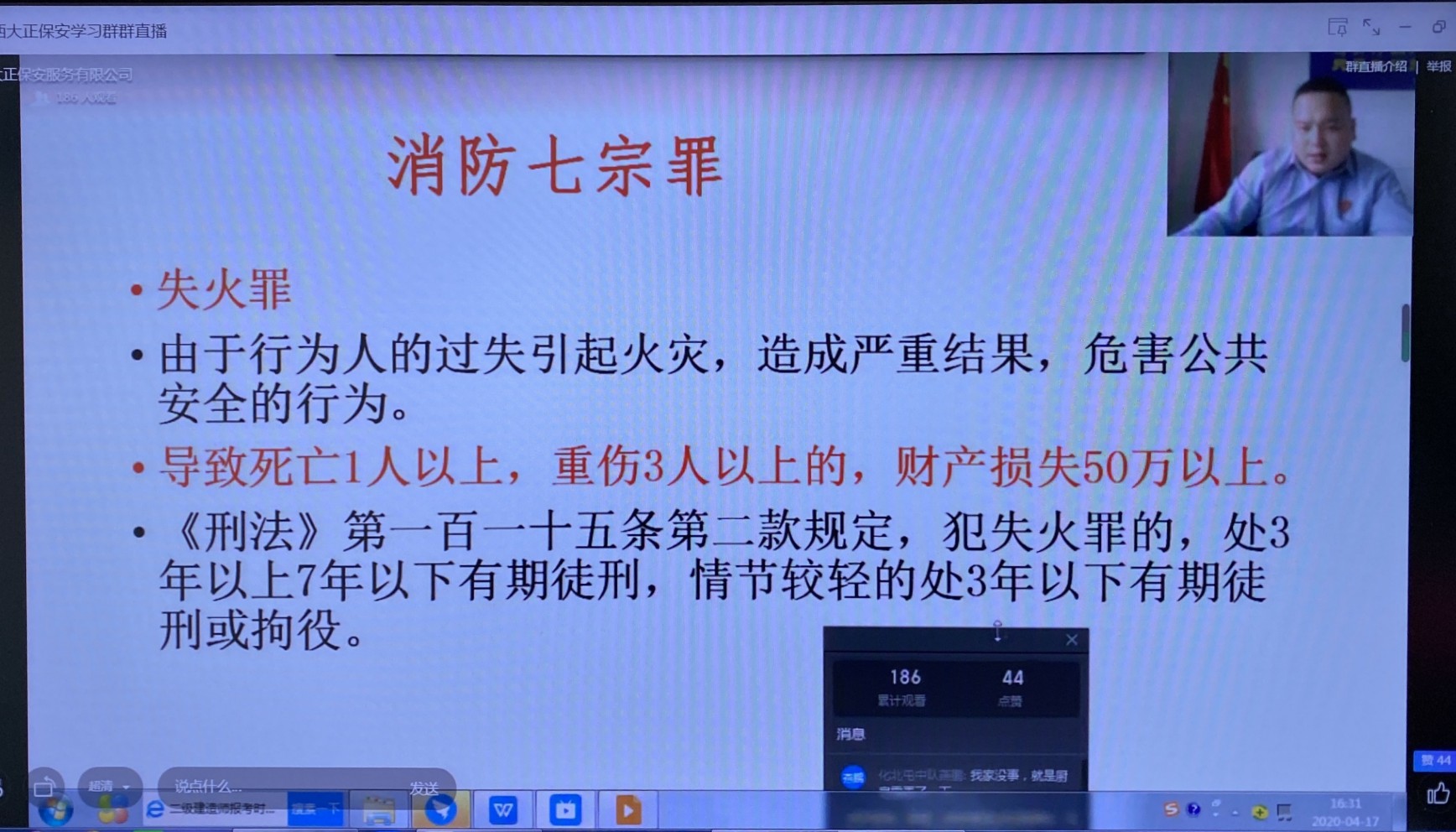 為響應(yīng)國家號召,貫徹“預(yù)防為主,防消結(jié)合”的方針,做到科學(xué)應(yīng)對,力求人人講安全,人人會安全。4月17日,公司特邀山西陽光眾安消防科技有限公司忻州分公司講師黃前對我公司員工進行線上安全教學(xué)。公司機關(guān)干部、全體黨員等200余人參加。