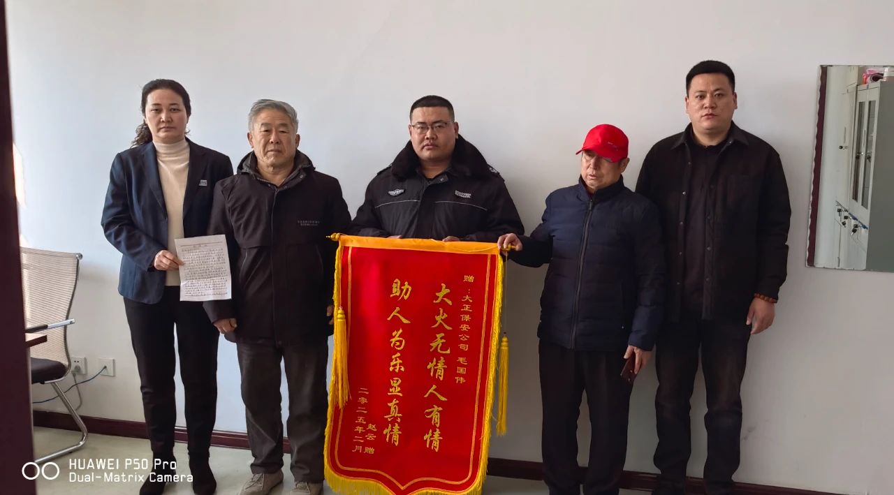 2025年2月25日上午,忻州市保安服務公司迎來感人一幕:兩位六旬老人手捧一面繡有“大火無情人有情,助人為樂顯真情”的錦旗和一封情真意切的感謝信,對公司保安員毛國偉的英勇行為進行表彰。