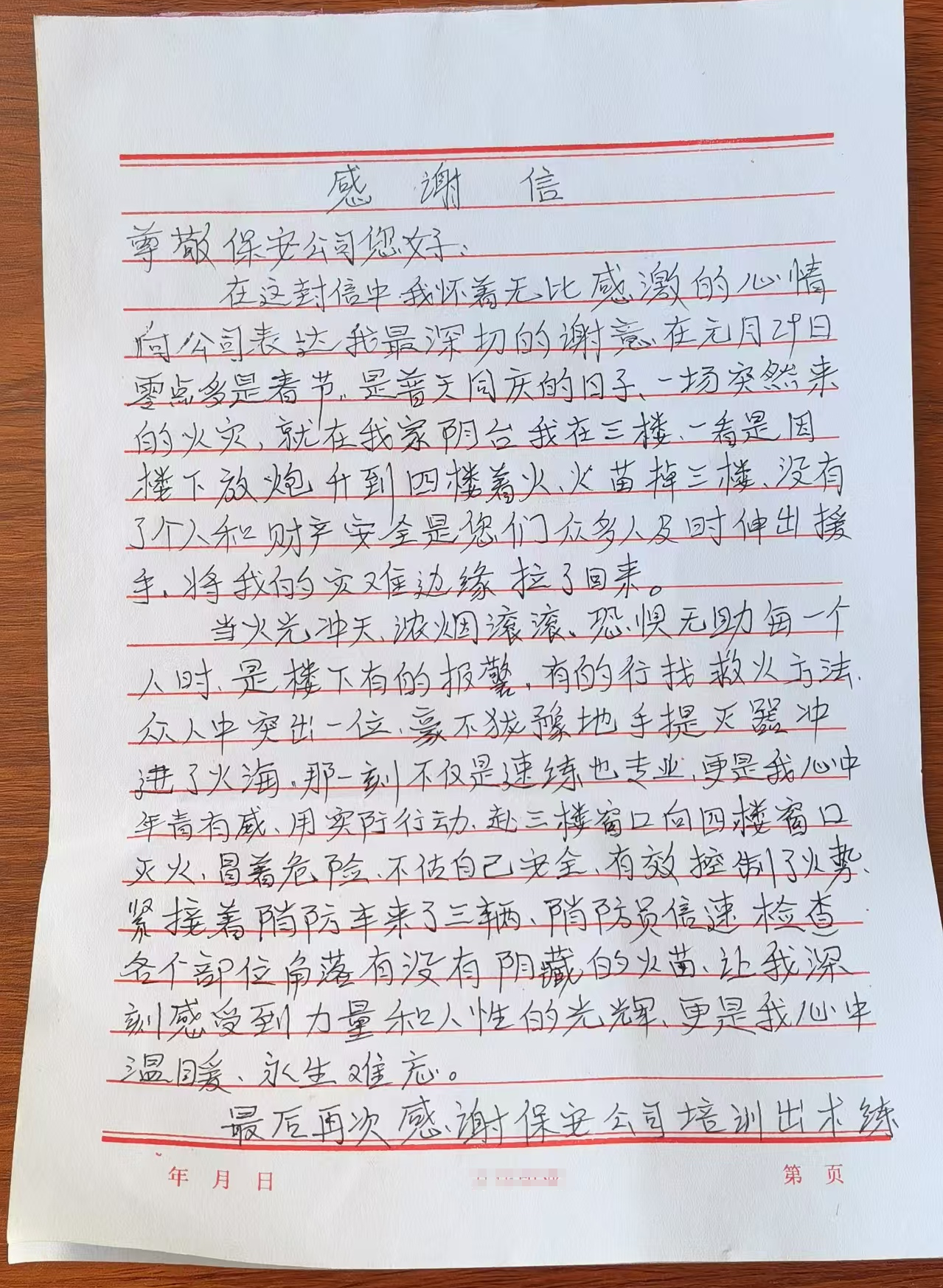 在感謝信中,兩位老人用質樸的語言表達了對毛國偉的深深感激,并對忻州市保安服務公司表示高度贊揚。此次應急處置事件不僅展現了毛國偉個人的專業(yè)素養(yǎng)和勇敢精神,更是忻州市保安服務公司注重安全生產、常態(tài)化開展消防安全培訓和應急處突演練的成果體現。