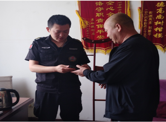 5月9日,山西大正億通保安安全技術公司巡邏隊隊員楊鑫磊、姜濤在開展日常巡邏工作中,在某銀行發(fā)現(xiàn)一個黑色駕駛證本,里面裝有現(xiàn)金、證件及銀行卡。