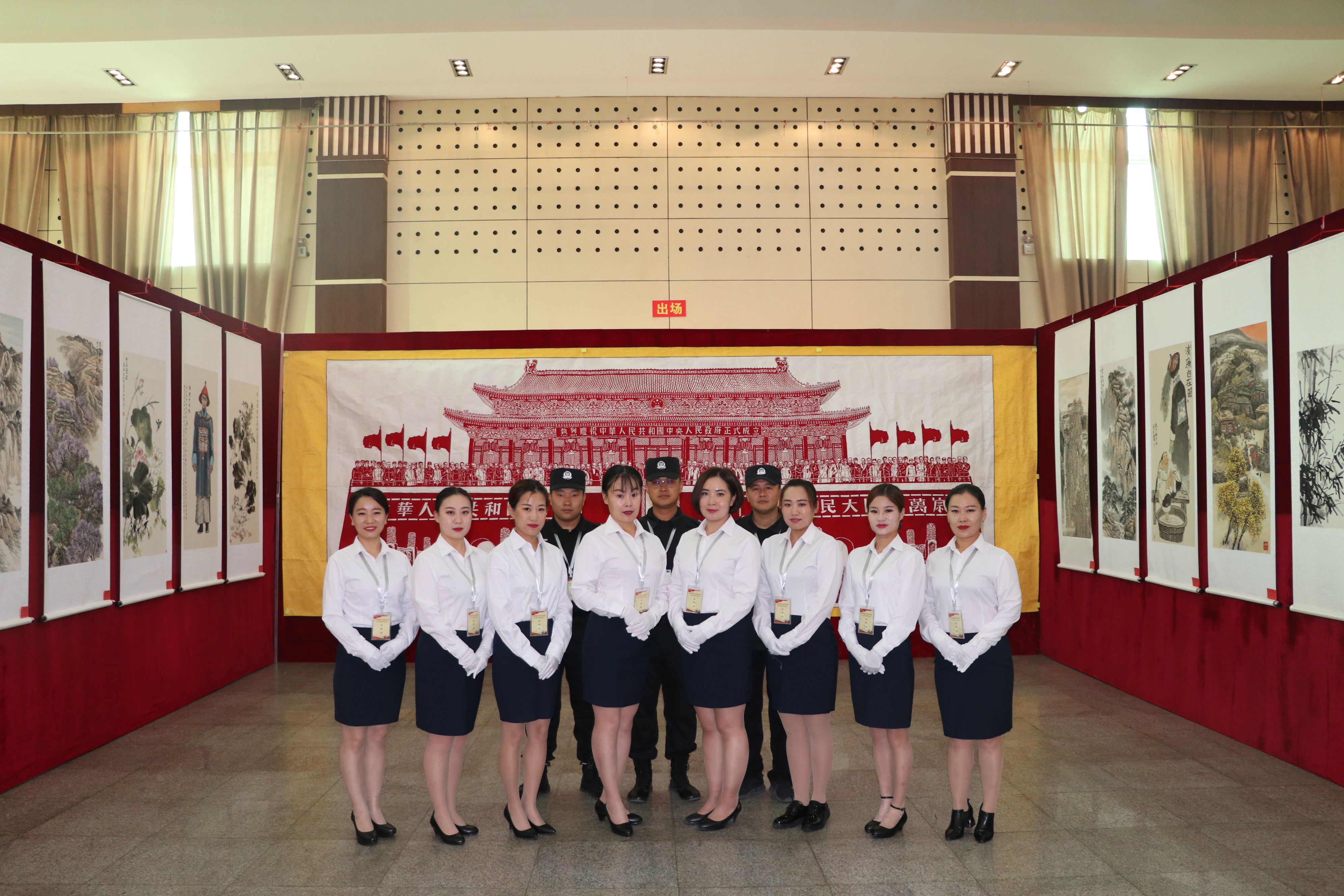 此次巡展意義非凡,文化藝術(shù)公司更是嚴(yán)陣以待。9月19號(hào)到黨校進(jìn)行為期4天的會(huì)場布置,在男隊(duì)員外出勤務(wù),隊(duì)里沒有男隊(duì)員的情況下,女隊(duì)員們充當(dāng)搬卸工,實(shí)木的桌椅又大又沉,女隊(duì)員們喊著號(hào)子,堅(jiān)持著硬是搬了200余張桌子,千余把椅子,四天里搬桌椅協(xié)助男隊(duì)員搭桁架,掛展出的作品,隨處都有女隊(duì)員的身影。巡展現(xiàn)場,8名女隊(duì)員負(fù)責(zé)禮儀引導(dǎo),微笑服務(wù),在場的領(lǐng)導(dǎo)紛紛為我們的女隊(duì)員豎起大拇指。